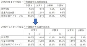 今まで事業者の裁量で福祉・介護職員以外への配分も認められていましたが、2026年6月より支援に携わらない方への配分がOKになりました。それに伴い加算率が引き上げられました。